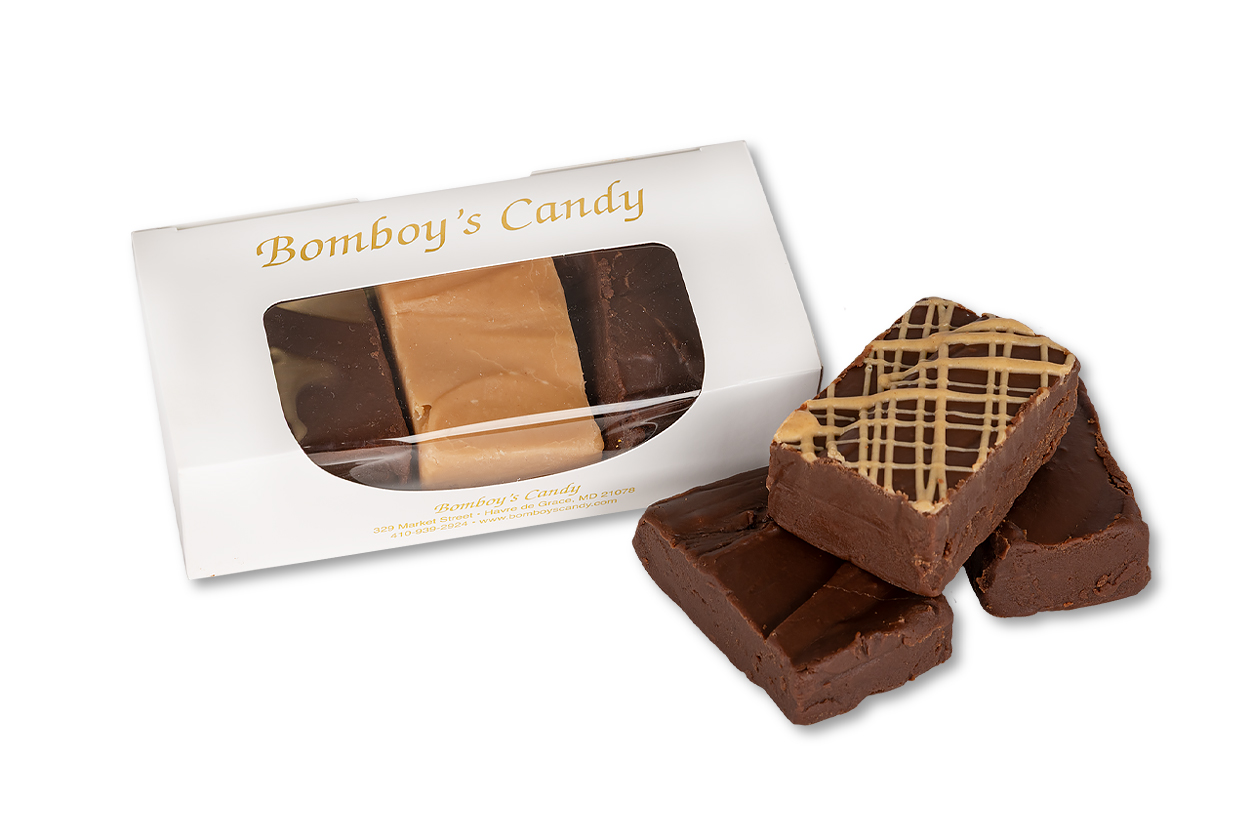 Our brand new Fudge Gift Box! We have 3 different options available, and each box contains 3 large pieces of fudge. Each box is approx. 14oz.